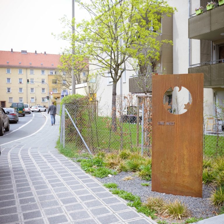 Vier Stelen und eine Bodenintarsie im Nürnberger Stadtteil Gibitzenhof setzen Zeichen für ein gelingendes Miteinander von Menschen unterschiedlicher religiös-kultureller Prägung.